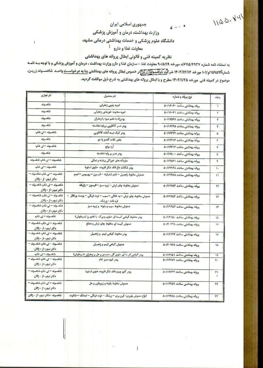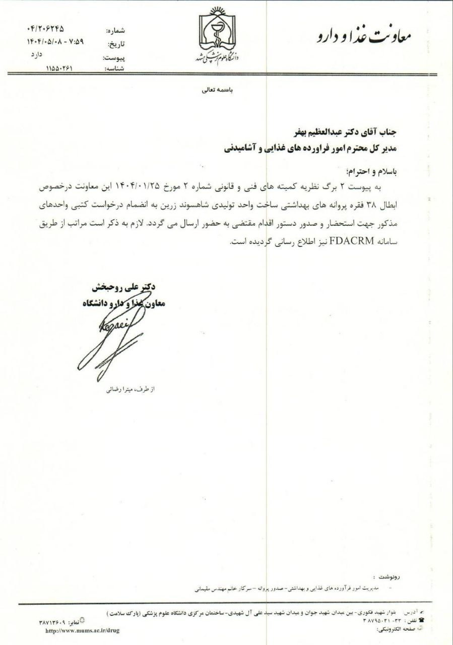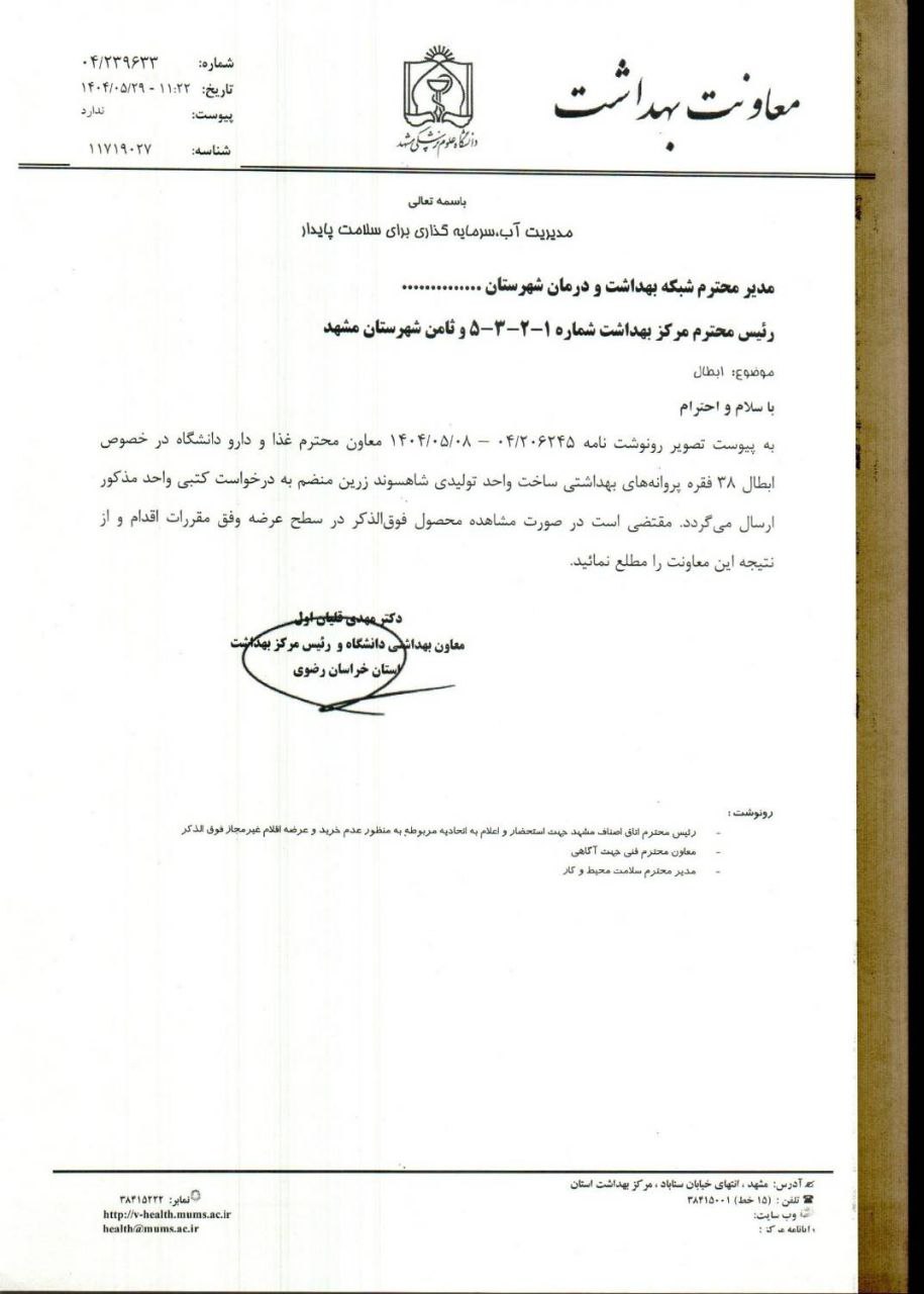 تصویر نامه معاون بهداشتی دانشگاه و رئیس مرکز بهداشت استان خراسان رضوی با موضوع ابطال ۳۸ فقره پروانه بهداشتی ساخت واحد تولیدی شاهسوند زرین بنا به خواست شرکت مذکور به شرح نامه های پیوست.