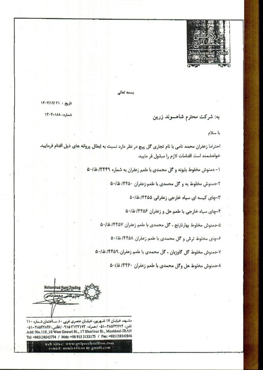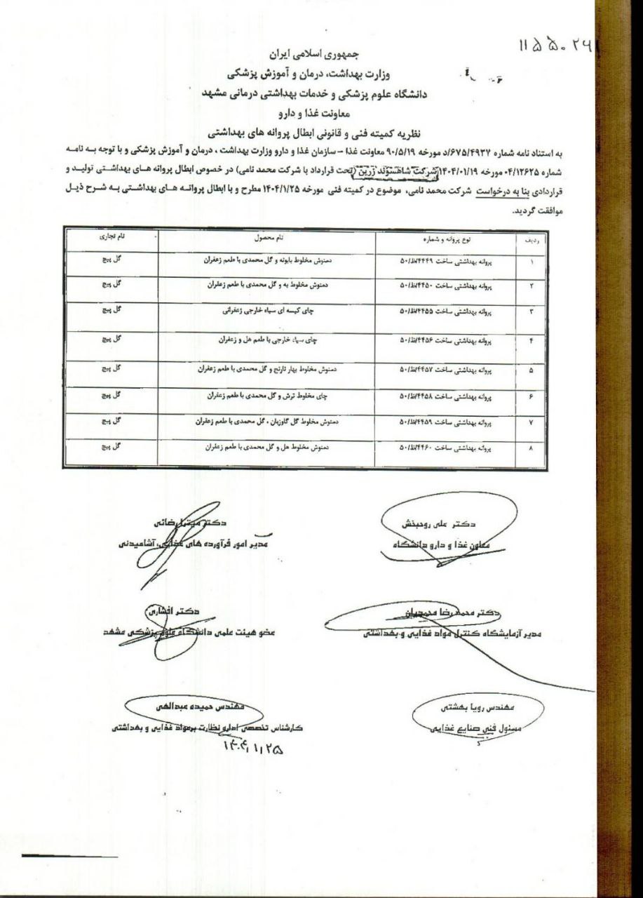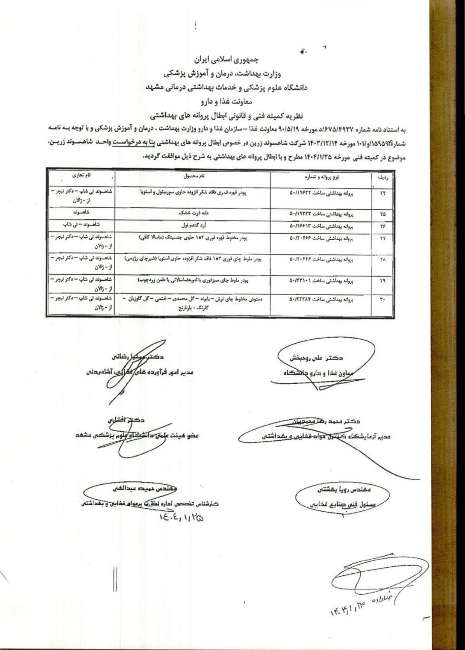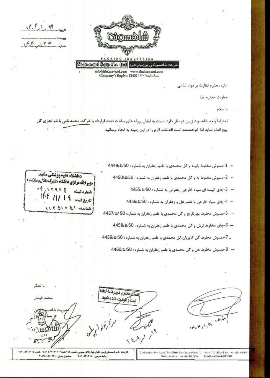 تصویر نامه معاون بهداشتی دانشگاه و رئیس مرکز بهداشت استان خراسان رضوی با موضوع ابطال ۳۸ فقره پروانه بهداشتی ساخت واحد تولیدی شاهسوند زرین بنا به خواست شرکت مذکور به شرح نامه های پیوست.