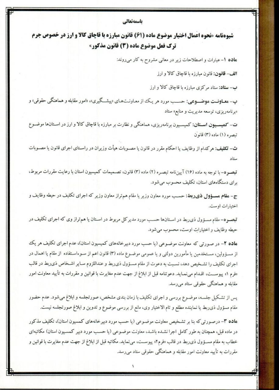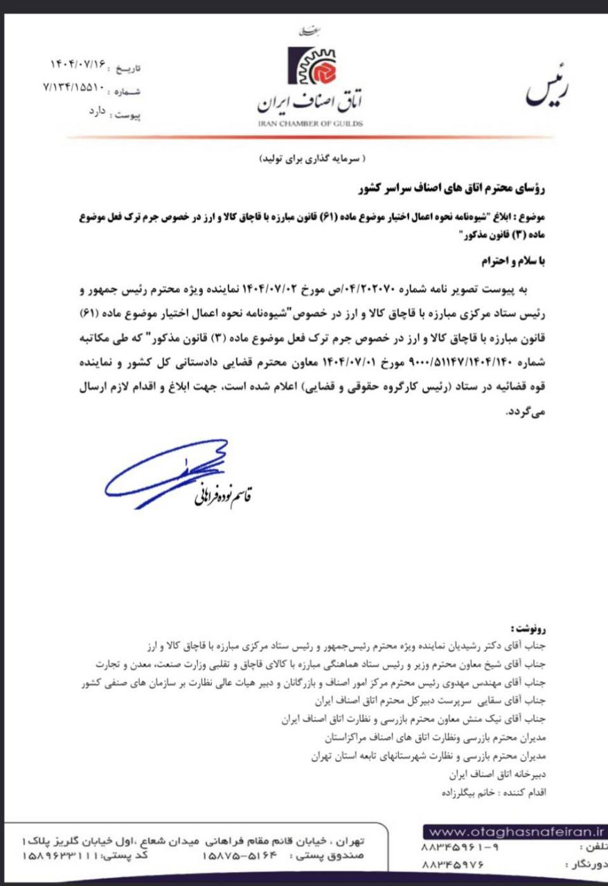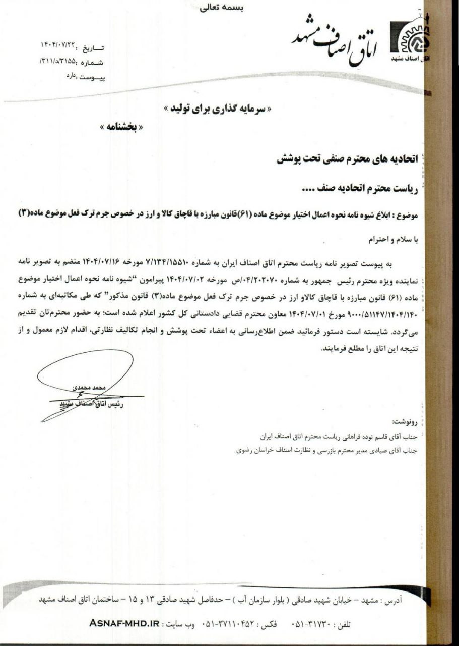 تصویر نامه اتاق اصناف مشهد با موضوع ابلاغ شیوه نامه نحوه اعمال اختیار موضوع ماده (۶۱) قانون مبارزه با قاچاق کالا و ارز در خصوص جرم ترک فعل موضوع ماده (۳) جهت استحضار همکاران گرامی