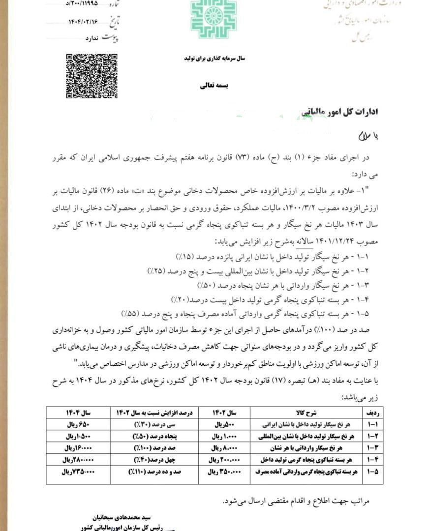 تصویر نامه ۱۱۹۹۵/د/۲۰۰ مورخه ۱۴۰۴/۹۲/۱۶ سازمان امورمالیاتی کشور با موضوع اعلام نرخ مالیات و عوارض ارزش افزوده انواع سیگار و توتون و تنباکو (محصولات دخانی) در سال ۱۴۰۴