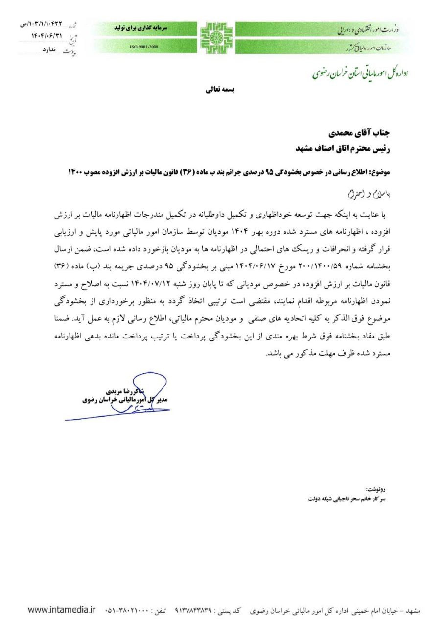 تصویر نامه ۱۰۴۲۲ مدیرکل امور مالیاتی خراسان رضوی در مورد بخشودگی ۹۵٪ جرایم بند ب مادا ۲۶ قانون مالیات بر ارزش افزوده مصوب ۱۴۰۰