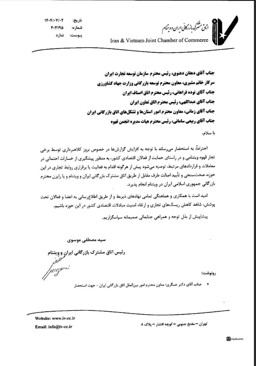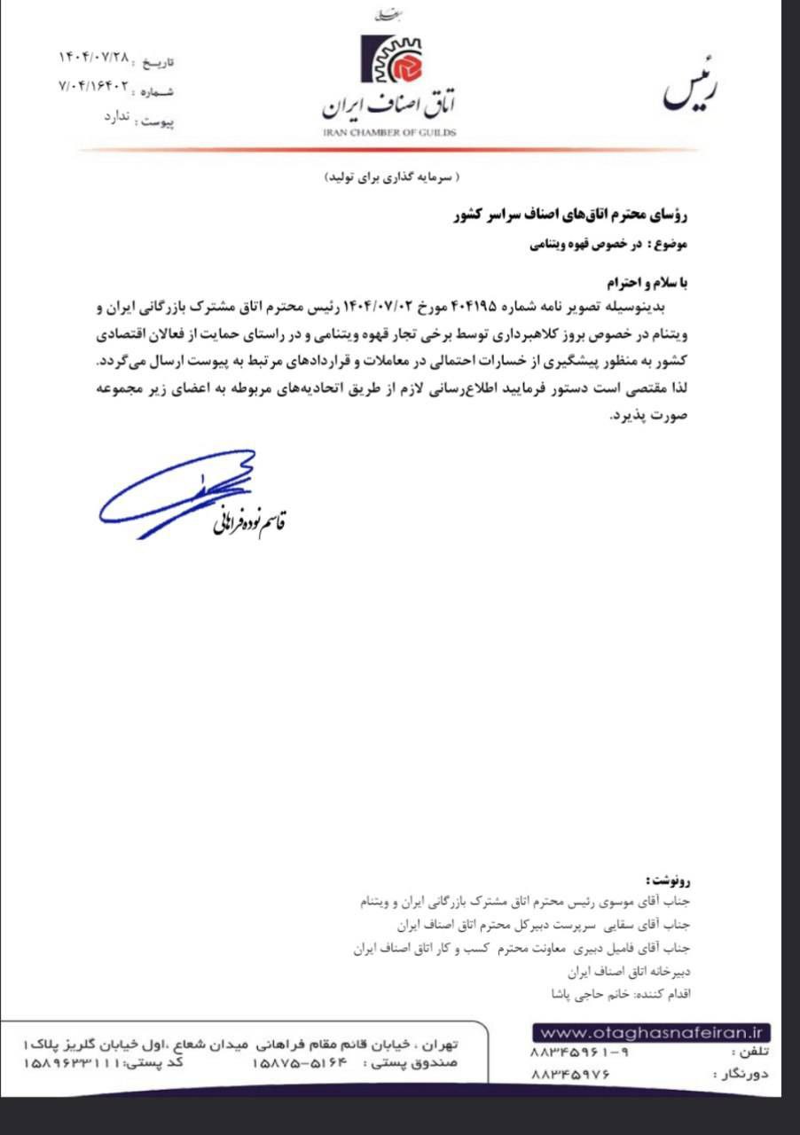همکاران گرامی در رسته عمده فروشی قهوه حسب نامه رئیس اتاق مشترک بازرگانی ایران و ویتنام؛ باتوجه به افزایش گزارش ها در مورد بروز کلاهبرداری توسط برخی تجار قهوه ویتنامی و به منظور پیشگیری از خسارات احتمالی در معاملات و قراردادهای مرتبط، توصیه می شود پیش از برقراری روابط تجلری در زمینه قهوه صحت سنجی و تایید اصالت طرف مقابل را از طریق اتاق مشترک ایران- ویتنام و یا رایزن محترم بازرگانی ایران در ویتنام انجام دهید.
