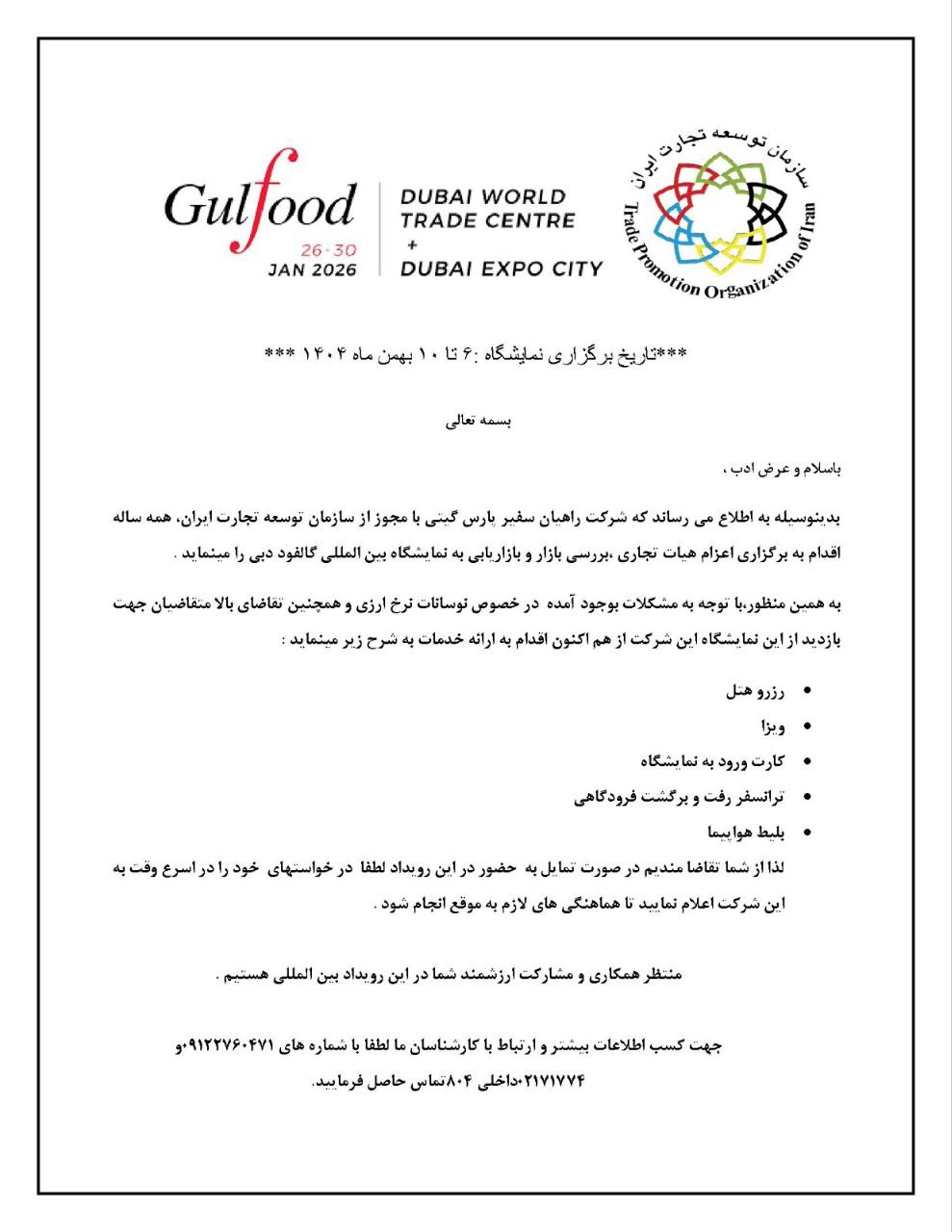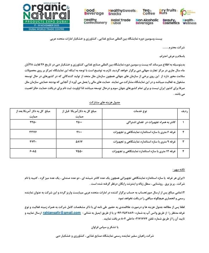 برگزاری نمایشگاه تخصصی صنایع غذایی، کشاورزی و خشکبار دبی