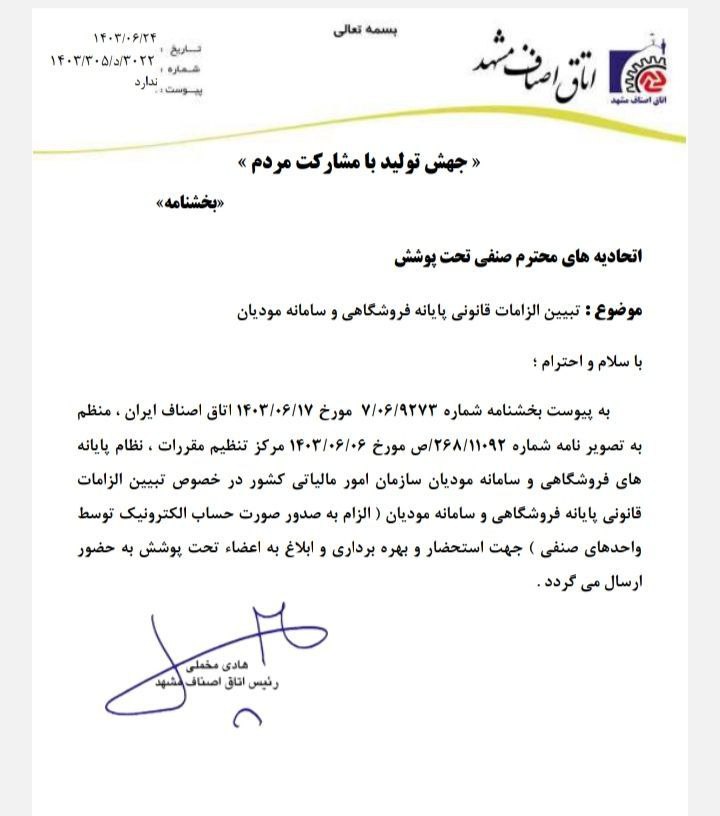 تصویر نامه اتاق اصناف ایران و مرکز تنظیم مقررات با موضوع بیان الزامات قانونی پایانه فروشگاهی و سامانه مودیان.
