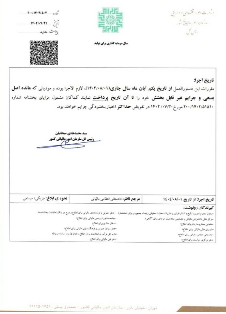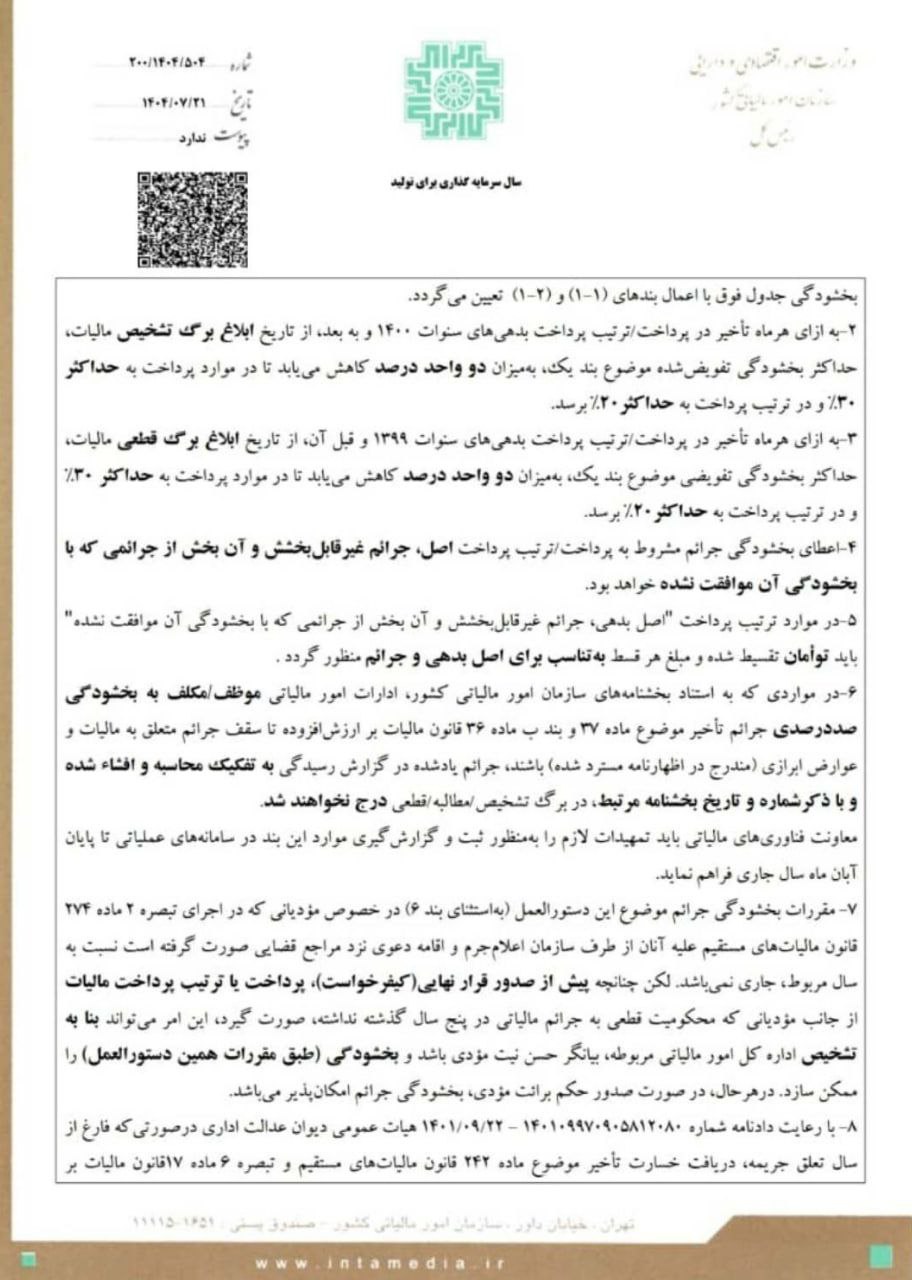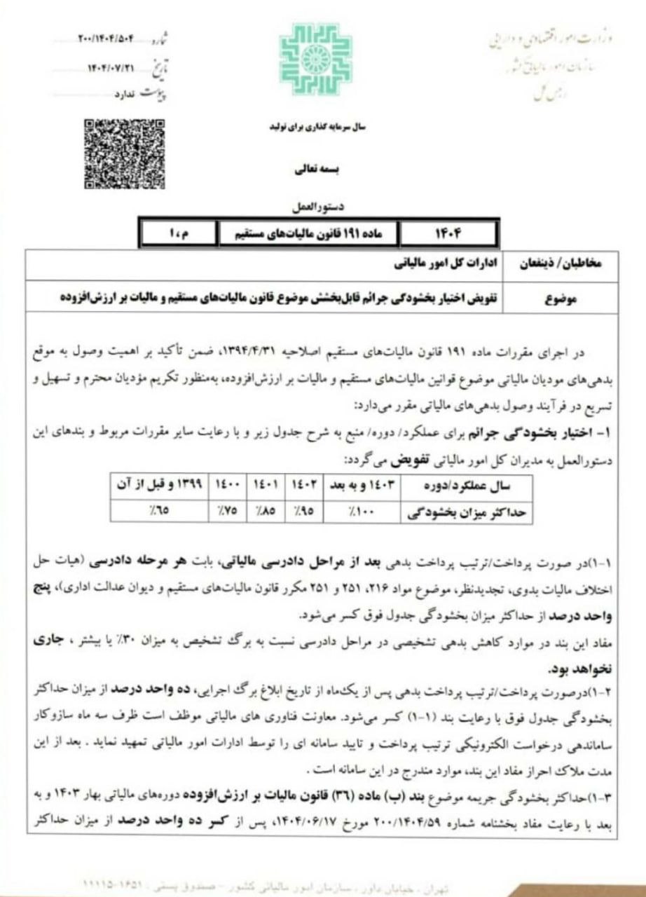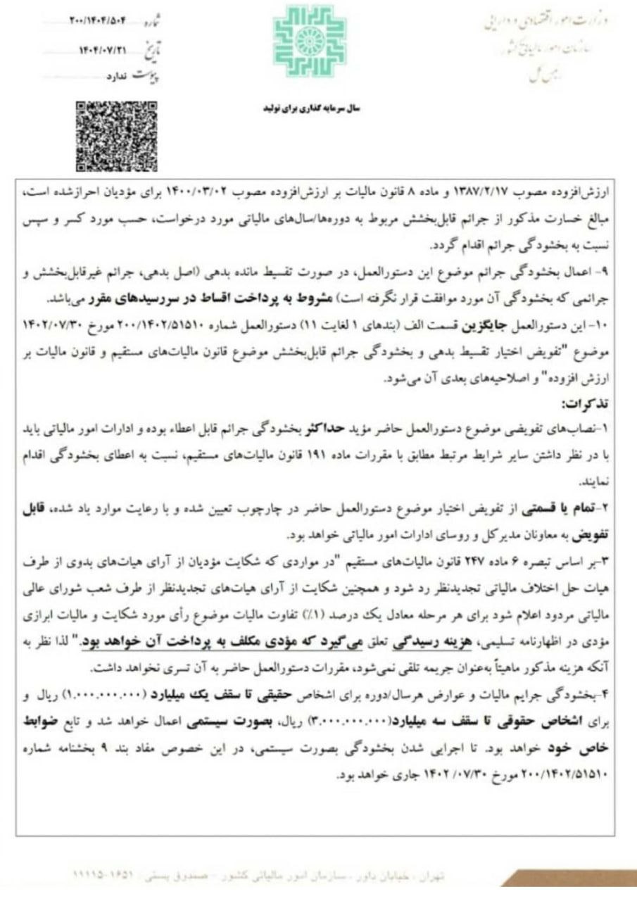 📑 تفویض اختیار بخشودگی جرائم قابلبخشش موضوع قانون مالیاتهای مستقیم و قانون مالیات بر ارزش افزوده برابر بخشنامه ۲۰۰/۱۴۰۴/۵۰۴ به تاریخ ۱۴۰۴/۰۷/۲۱ سازمان امور مالیاتی کشور