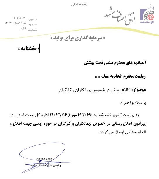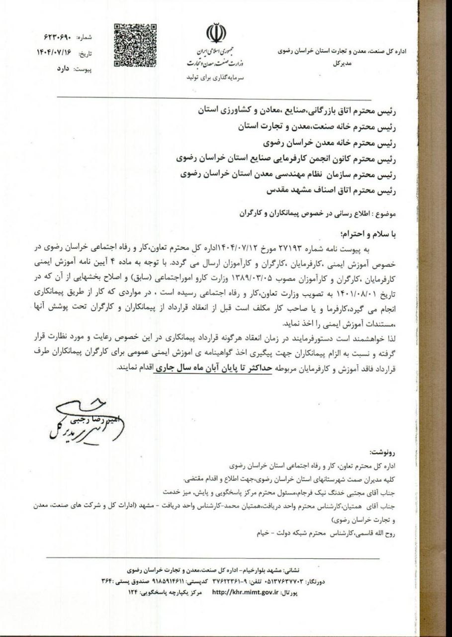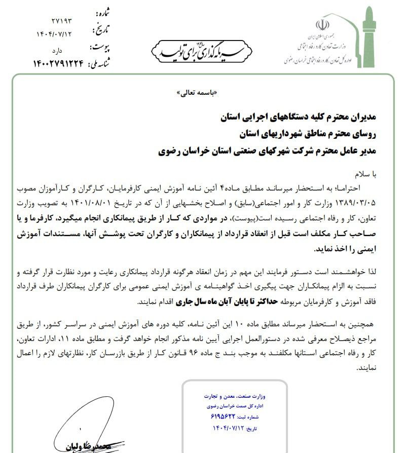 تصویر نامه مدیر کل تعاون، کار و رفاه اجتماعی خراسان رضوی جهت استحضار و بهره برداری.
