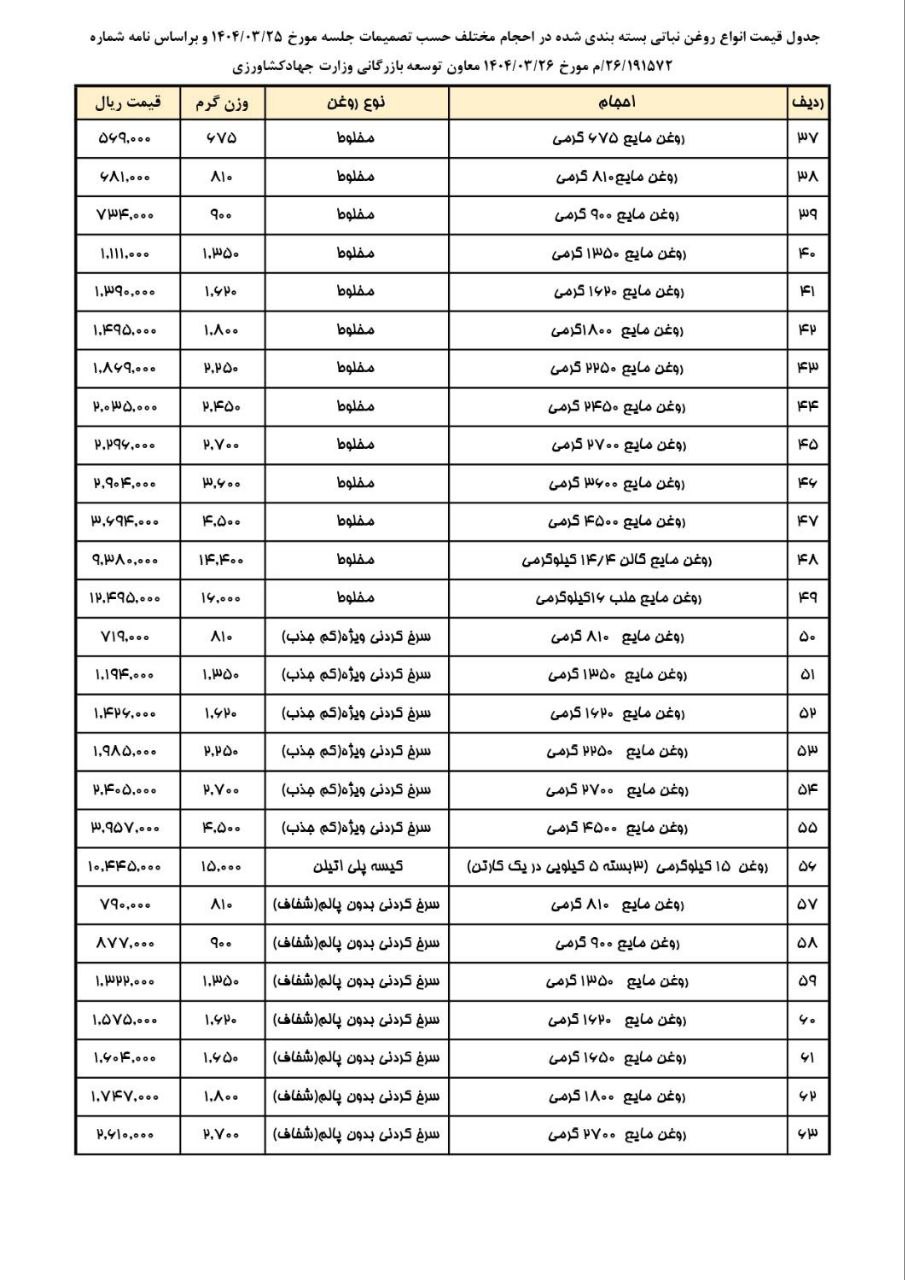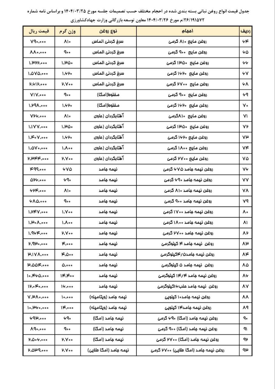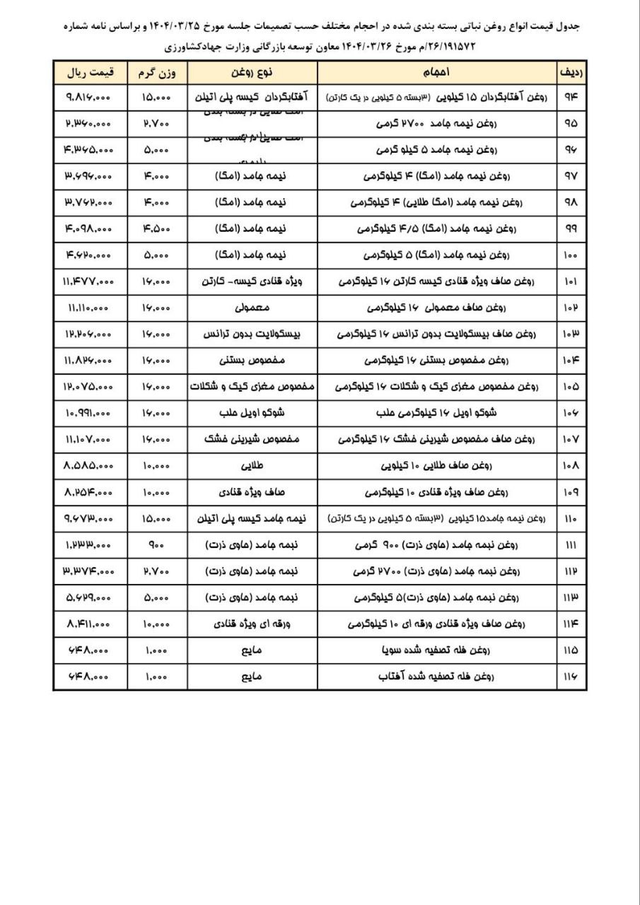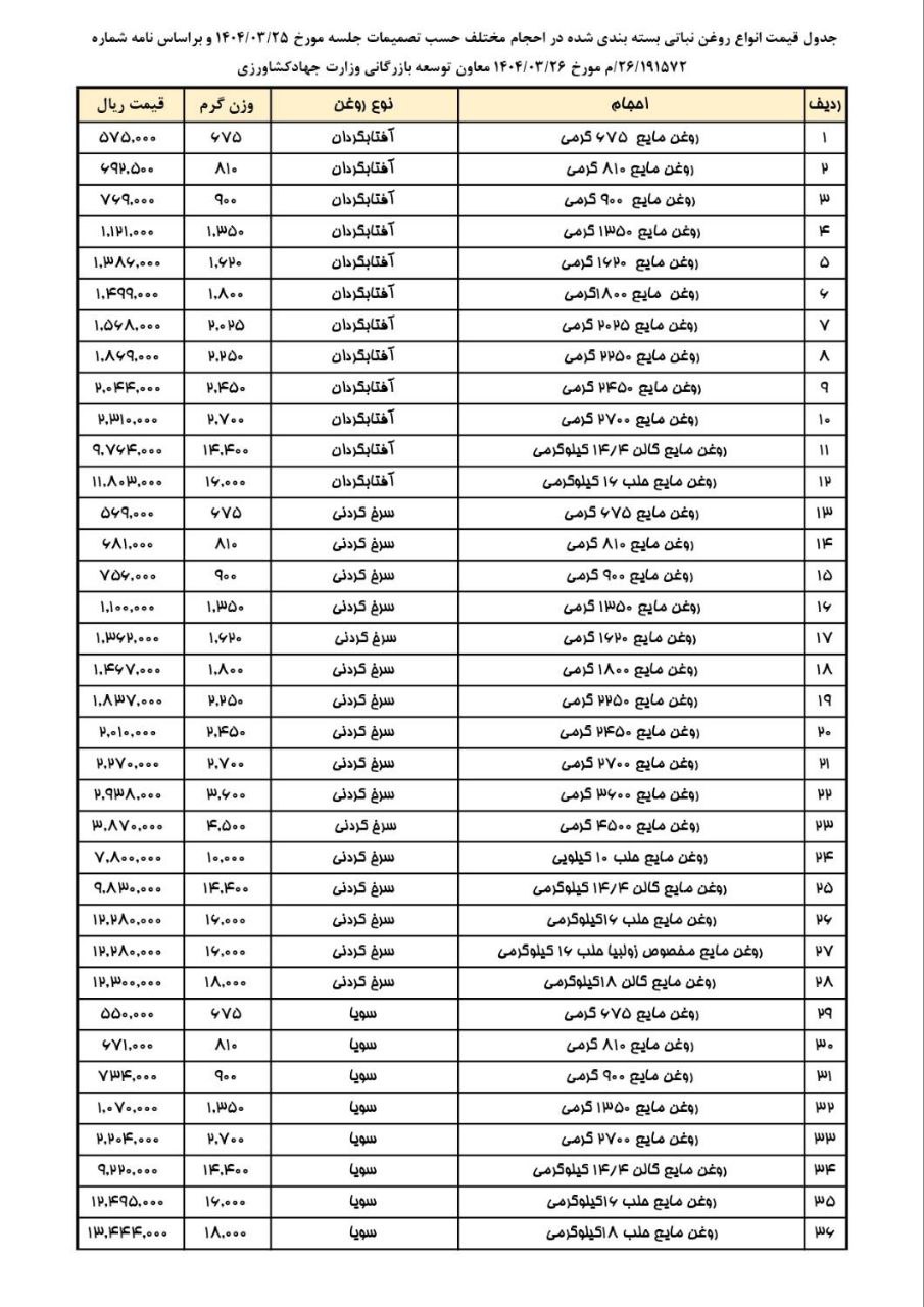 جدول قیمت انواع روغن خوراکی بسته بندی شده در حجم های مختلف مصوب جلسه ۲۵ خرداد ۱۴۰۴