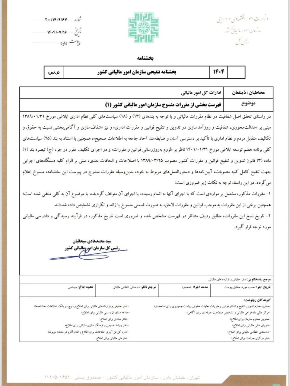 برابر بخشنامه تنقیحی به شماره ۲۰۰/۱۴۰۴/۶۷ به تاریخ ۱۴۰۴/۰۷/۱۶ سازمان امورمالیاتی کشور.