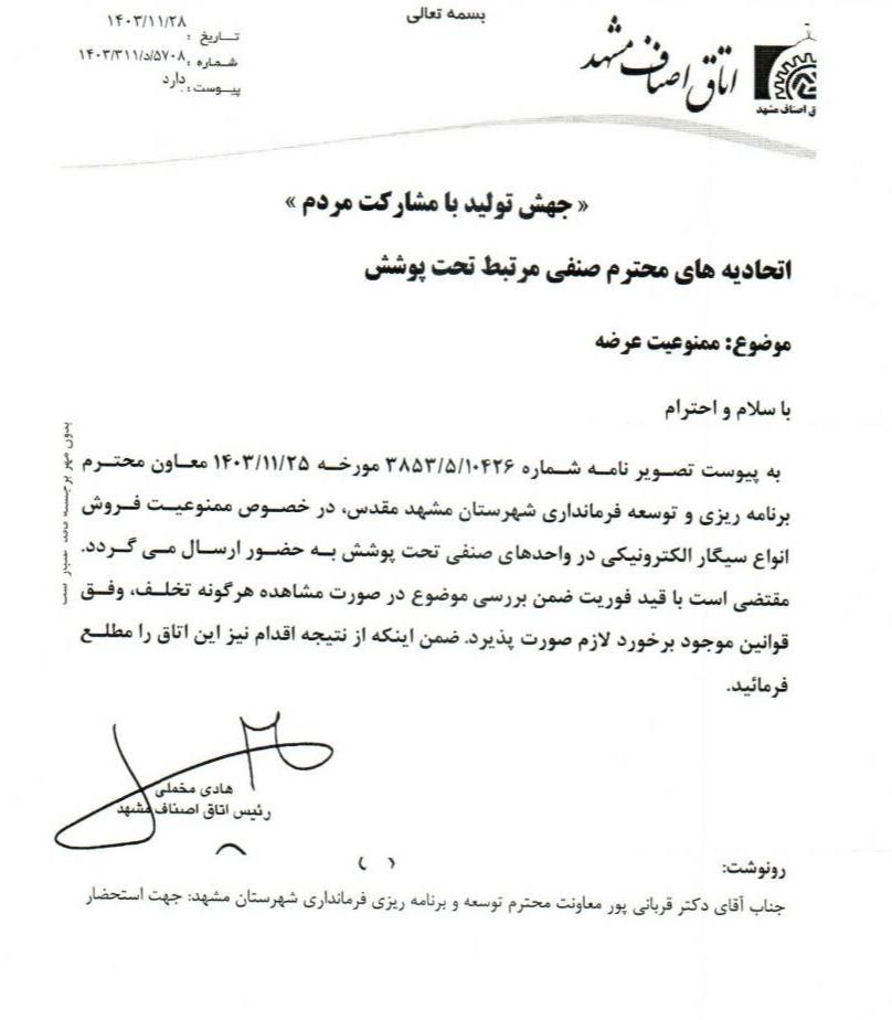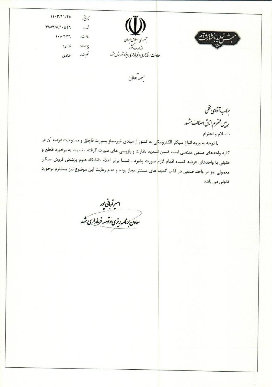 تصویر نامه معاون محترم برنامه ریزی و توسعه فرمانداری مشهد با موضوع ممنوعیت خرید و فروش انواع سیگار الکترونیکی که از مبادی غیرمجاز و به صورت قاچاق وارد کشور می شود و همچنین فروش سیگار در قفسه های درپوش دار.