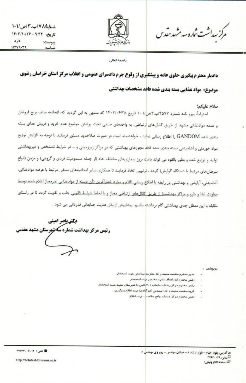 تصویر نامه مرکز بهداشت شماره ۳ مشهد مبنی بر اعلام موادغذایی غیرمجاز .