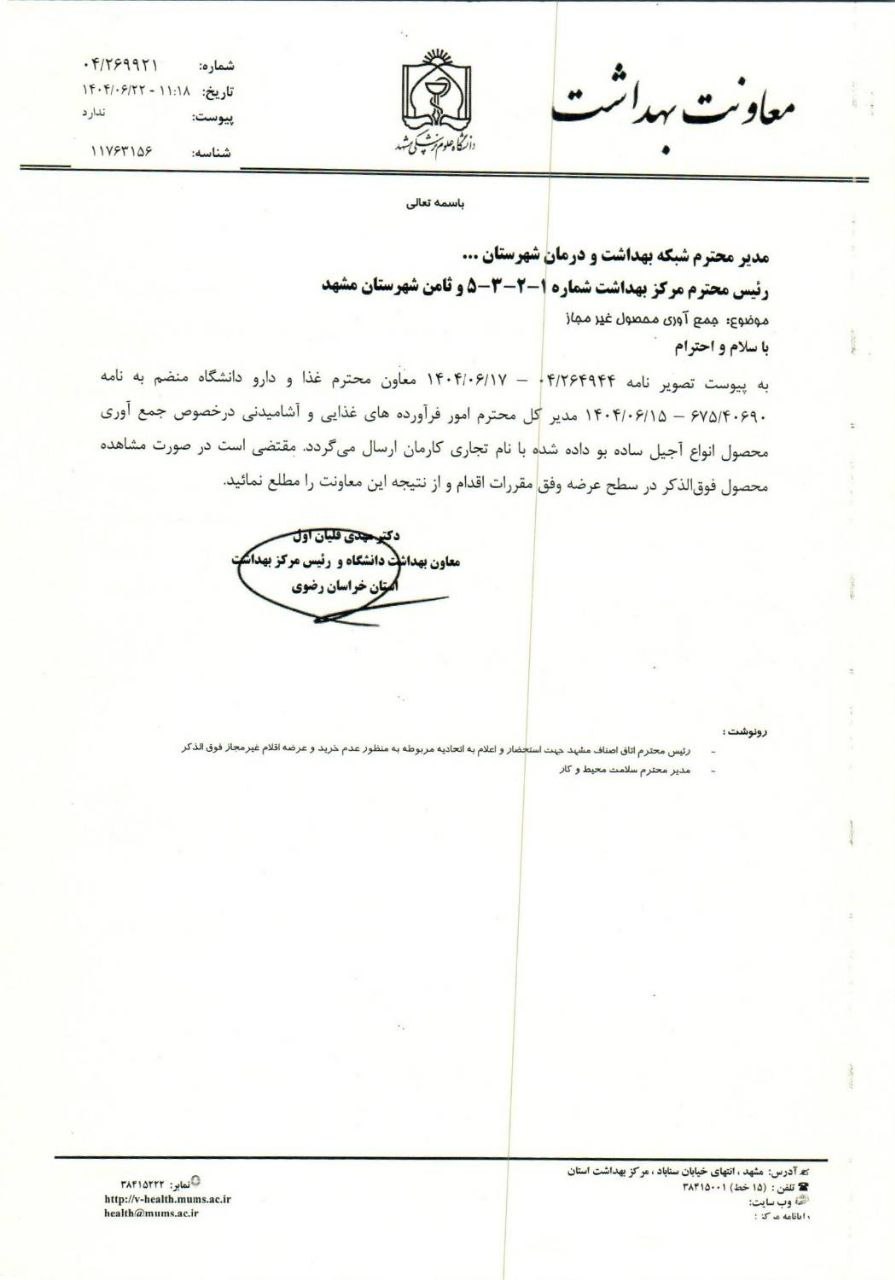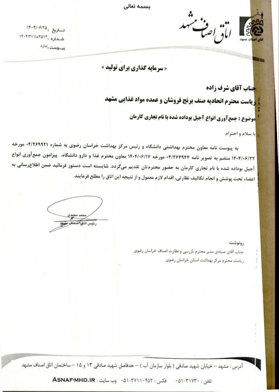 برابر نامه اتاق اصناف مشهد به آگاهی می رساند خرید و فروش و نگهداری انواع آجیل ساده بو داده شده با نام تجاری کارمان ممنوع می باشد.