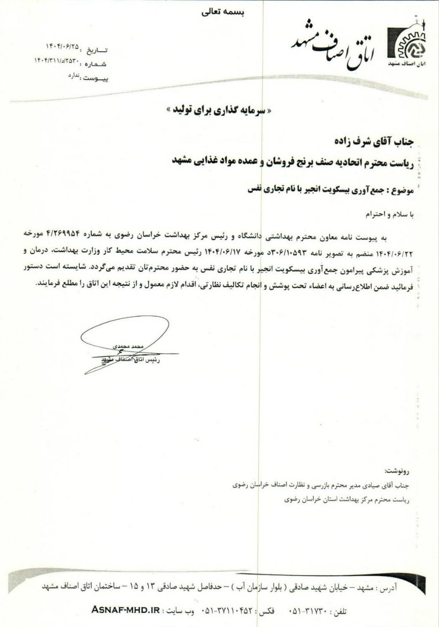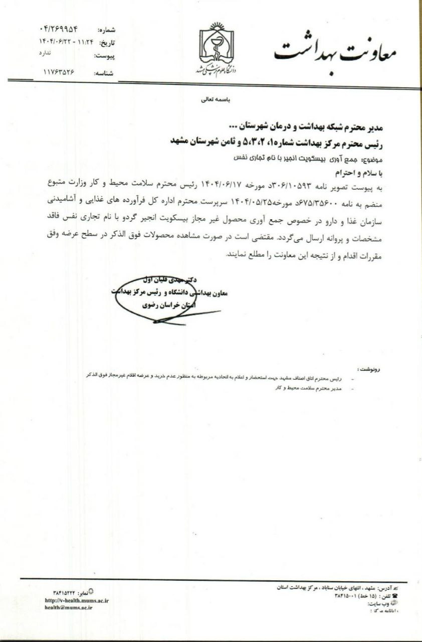 برابر نامه اتاق اصناف مشهد و معاون بهداشتی دانشگاه و رئیس مرکز بهداشت استان به آگاهی می رساند خرید و فروش و نگهداری (( بیسکویت انجیر گردو با نام تجاری نفس)) غیرمجاز ست.