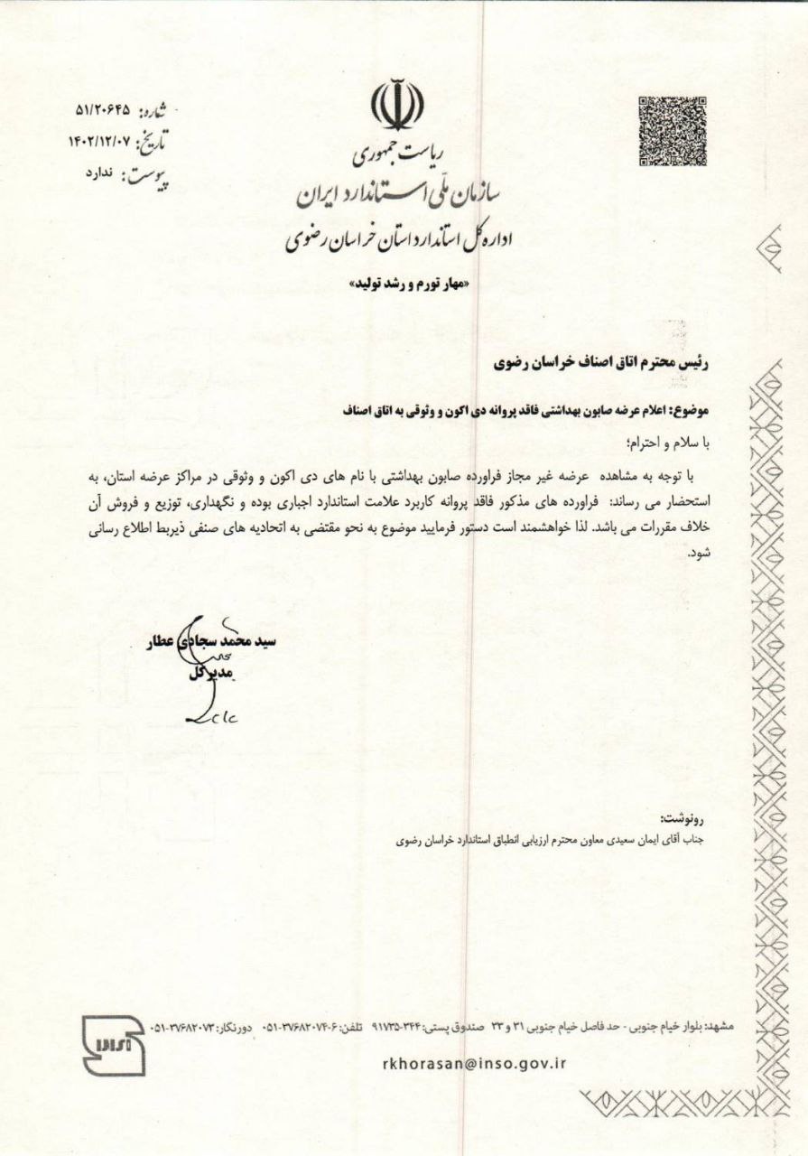 حسب نامه مدیرکل استاندارد خرید و فروش و نگهداری دو صابون با نام (دی اکون) و (وثوقی) خلاف قانون می باشد.