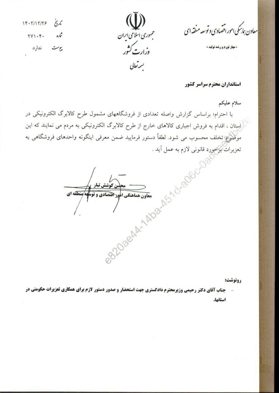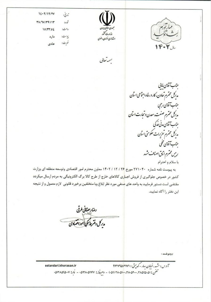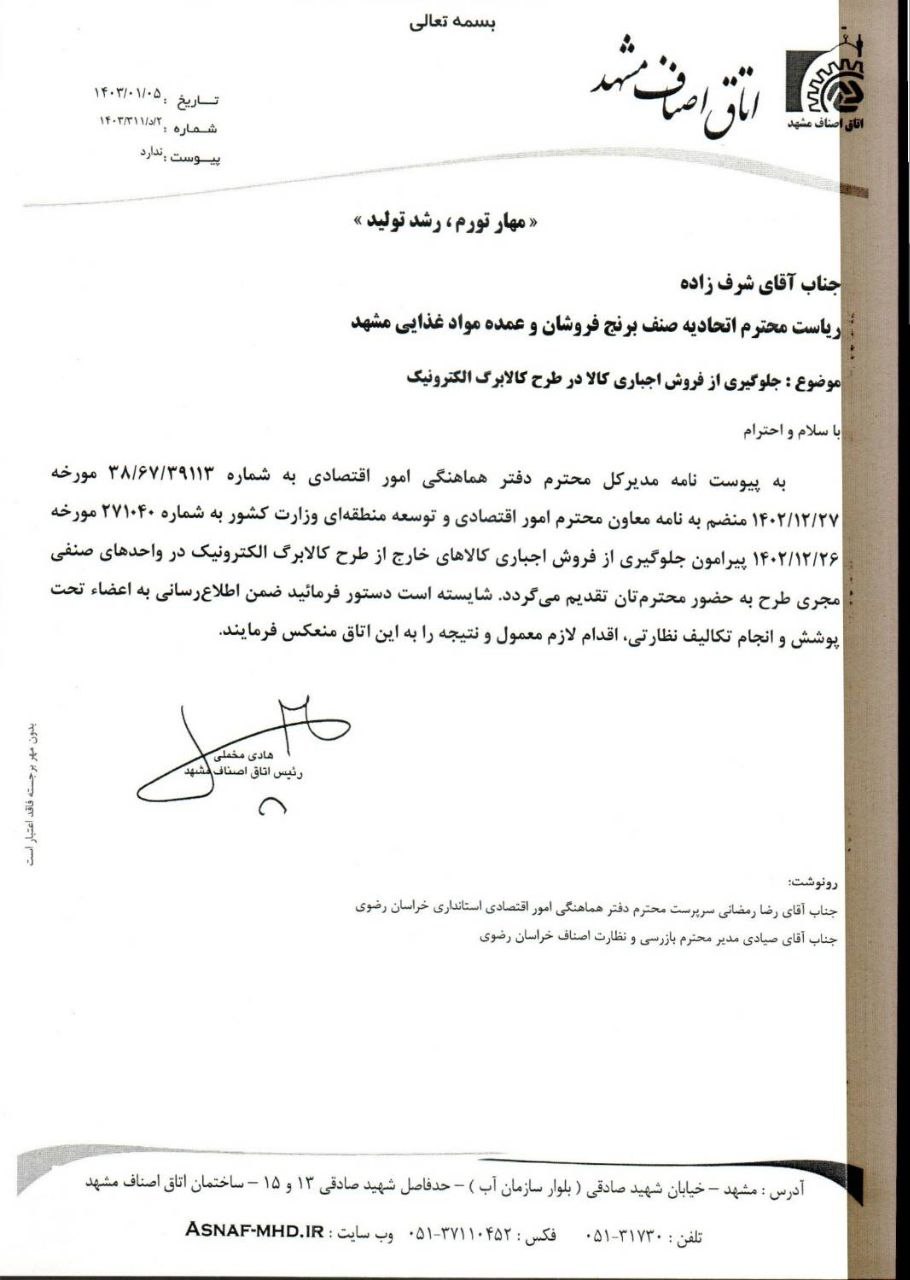 حسب نامه اتاق اصناف مشهد به اطلاع همکاران محترم می رساند فروش اجباری کالا ممنوع است به ویژه در واحدهای صنفی مشارکت کننده در طرح کالابرگ الکترونیک.