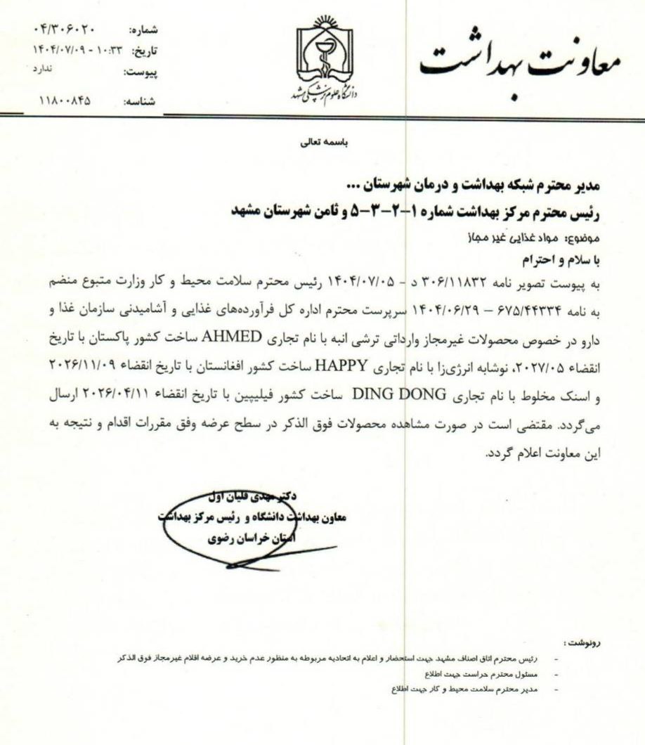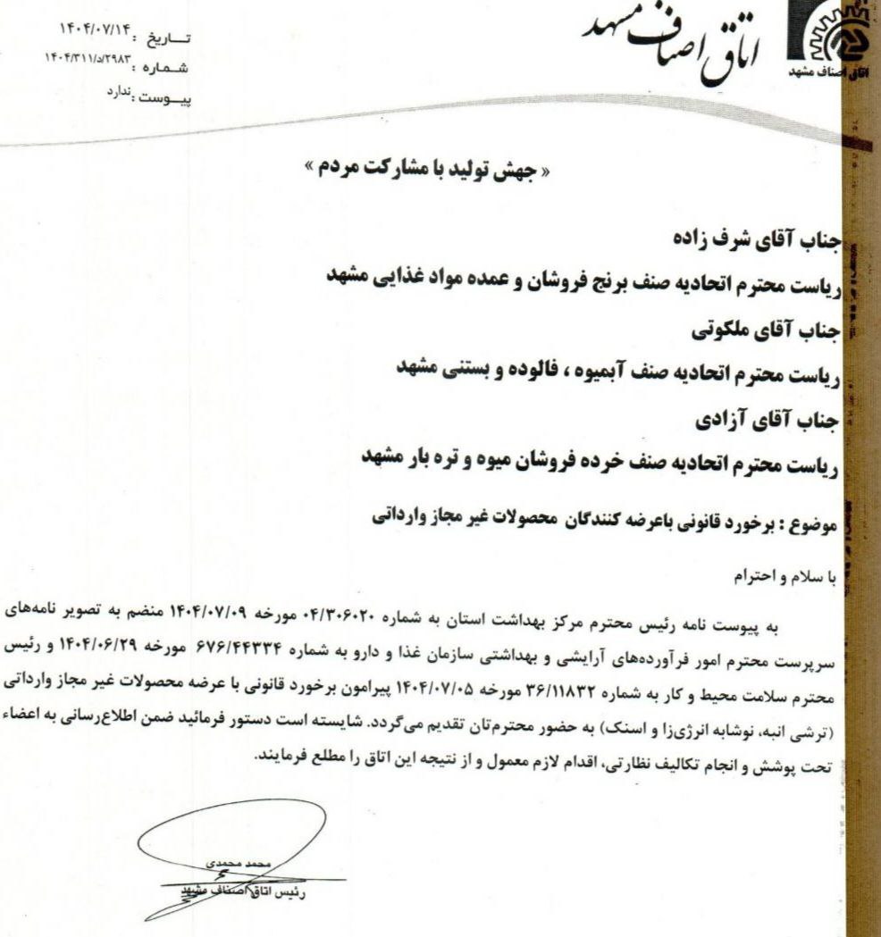 تصویر نامه اتاق اصناف مشهد مبنی بر برخورد قانونی با فروشندگان محصولات غیرمجاز وارداتی به شرح نامه مرکز بهداشت استان.