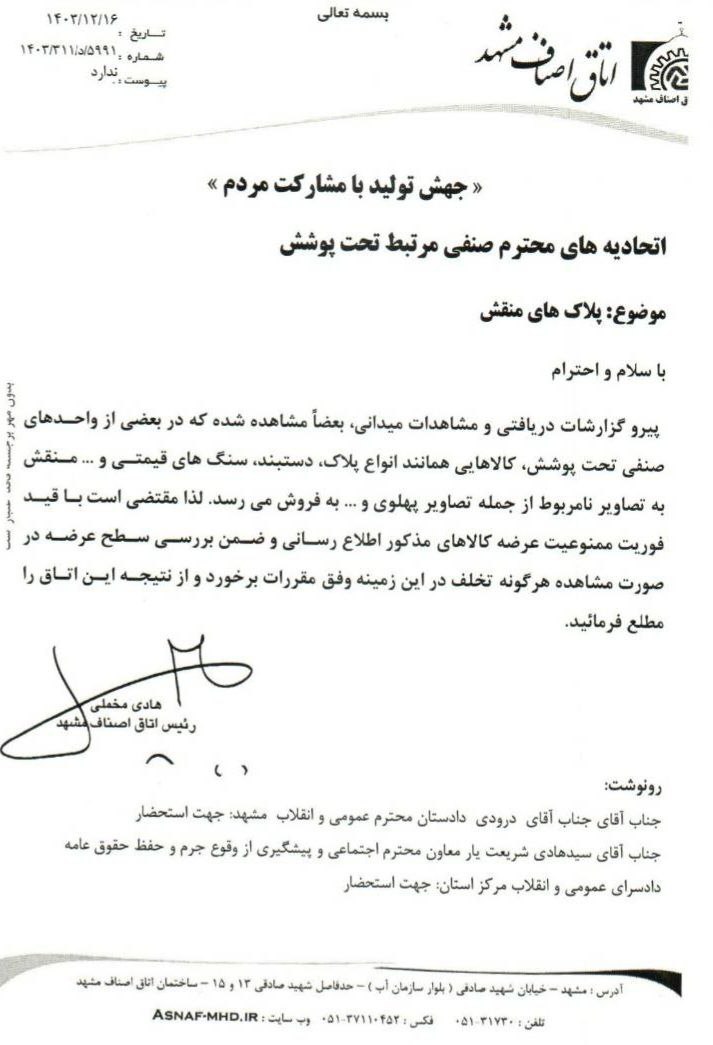 تصویر نامه اتاق اصناف مشهد با موضوع ممنوعیت فروش کالاهایی از جمله انواع پلاک و دستبند، سنگ های قیمتی و…. منقش به تصاویر نامربوط پهلوی و….