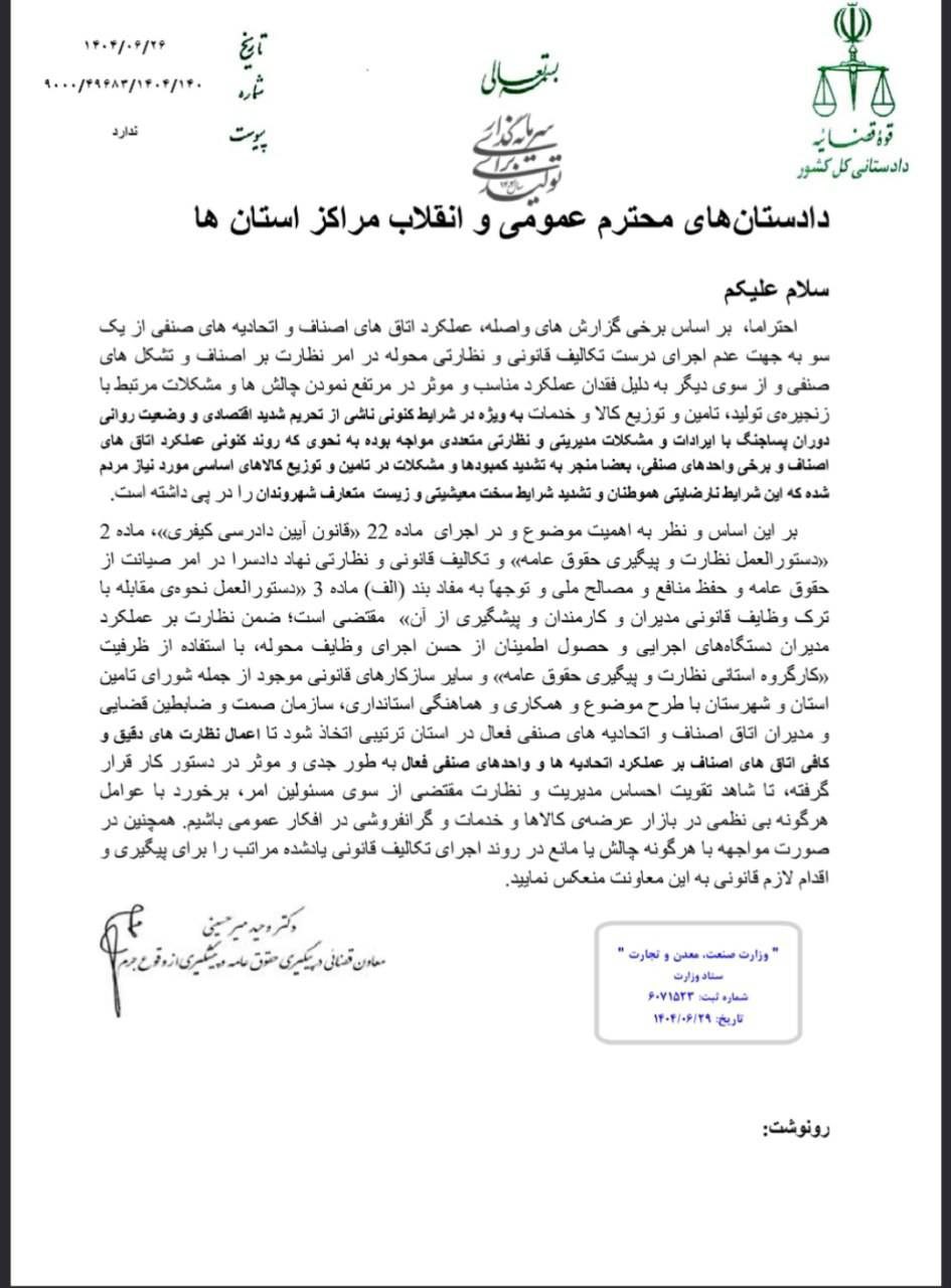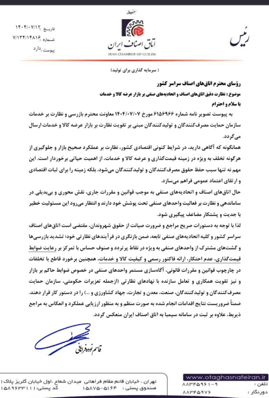 تصویر نامه اتاق اصناف ایران مبنی بر نظارت دقیق بر بازار عرضه کالا و خدمات در شرایط کنونی اقتصادی کشور و جلوگیری از هرگونه تخلف در زمینه قیمت گذاری و فروش کالا و خدمات به شرح نامه اشاره شده با تمرکز بر رعایت ضوابط قیمت گذاری، عدم احتکار، ارائه فاکتور رسمی و کیفیت کالا و خدمات.