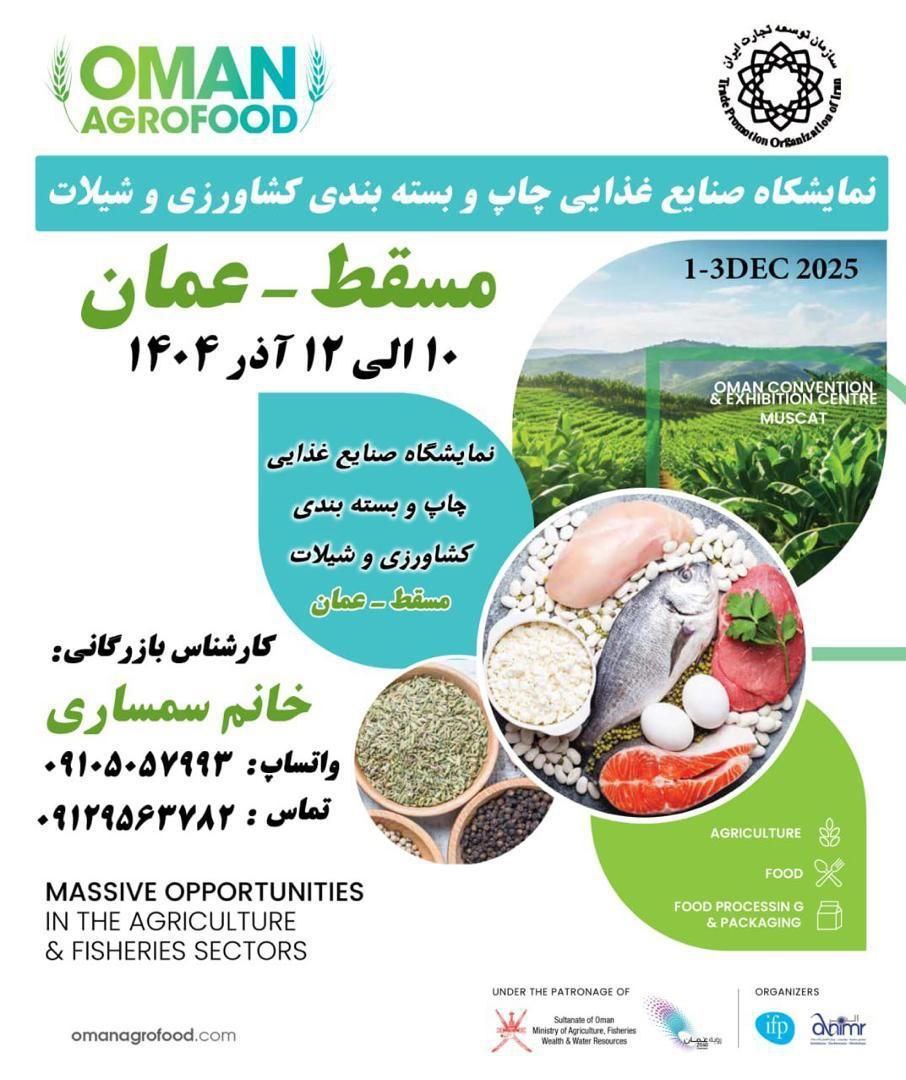 نمایشگاه صنایع غذایی چاپ و بسته بندی کشاورزی و شیلات نمایشگاه صنایع غذایی چاپ و بسته بندی کشاورزی و شیلات زمان: ۱۰ الی ۱۲ آذر ۱۴۰۴ مکان: مسقط- عمان