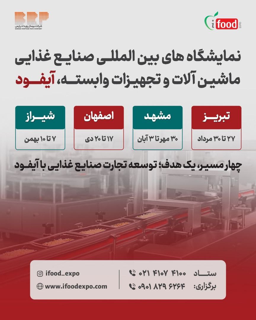 نمایشگاه های بین المللی صنایع غذایی ماشین آلات و تجهیزات وابسته، آیفود نمایشگاه های بین المللی صنایع غذایی ماشین آلات و تجهیزات وابسته، آیفود مشهد ۳۰مهر تا ۳ آبان ۱۴۰۴